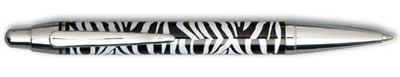 Ballpoint pen with black and white zebra print(black ink). Refillable with standard pen refill. Nice, heavy feel in the hand. Pens come in a gift box.