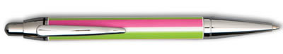 Ballpoint pen with hot pink and lime green stripes(black ink). Refillable with standard pen refill. Nice, heavy feel in the hand. Pens come in a gift box.