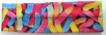 stretchy headband full coverage of image of gummy worms, perfect with our other gummy bear items! One size fits most.